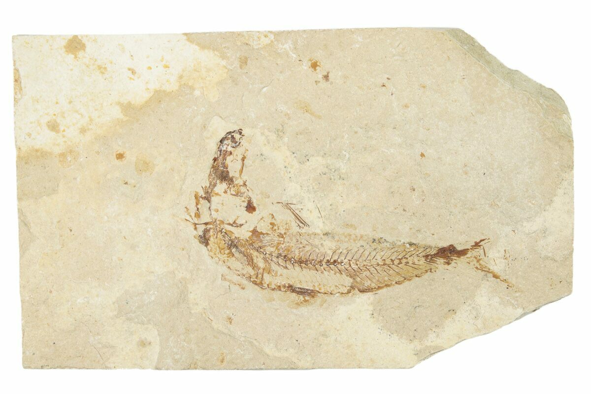 This is a 2.65" fossil fish from the famous marine lagerstätte of Hakel, Lebanon. It is Upper Cretaceous in age or approximately 94 million years old. Numerous species have been identified out of the region, making identification difficult. This specimen lacks enough detail to make any conclusions about identification.