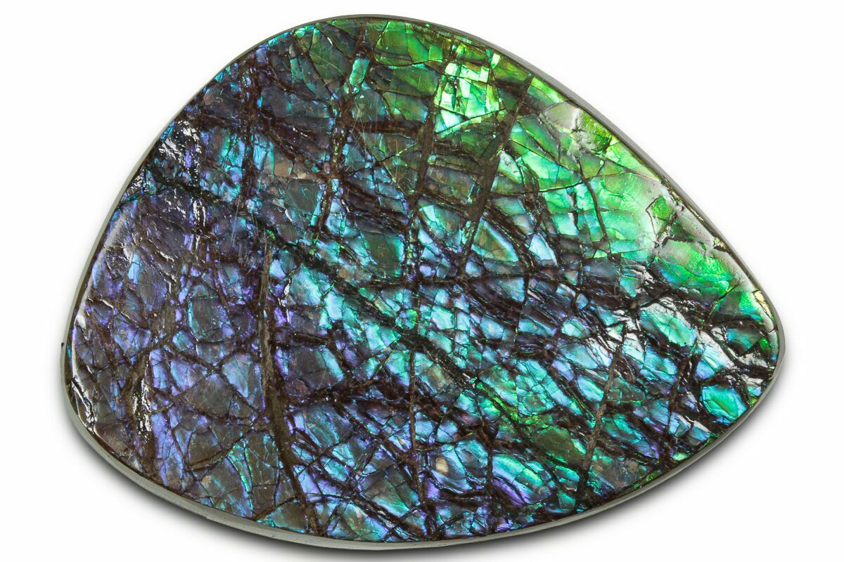 Ammolite is an opal-like gemstone found primarily in Alberta, Canada. It is a kind of fossilized shell from ammonites, which in turn are composed primarily of aragonite, the same mineral contained in nacre (mother-of-pearl). The shell's microstructures are often preserved. In 1981, ammolite was given official gemstone status by the World Jewellery Confederation (CIBJO).