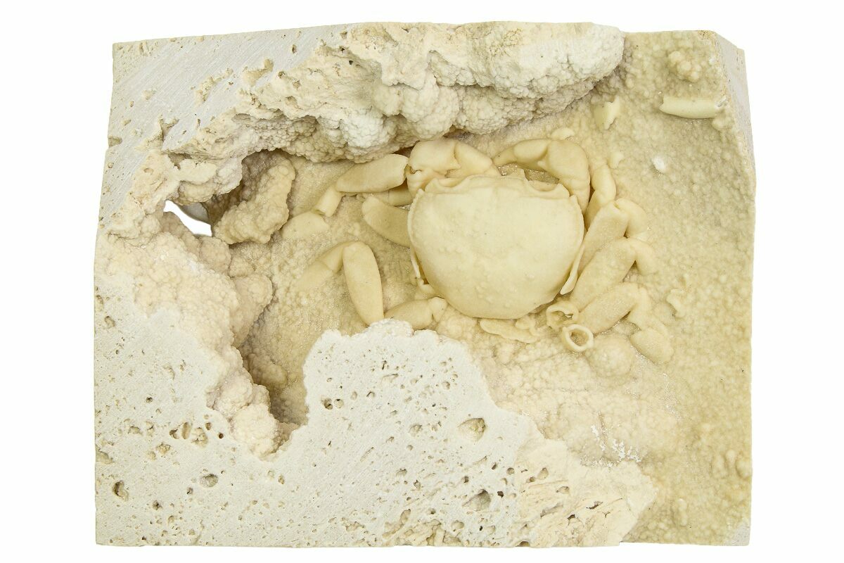 This is a spectacular fossil freshwater crab (Potamon potamios) preserved in travertine from the Denizli Basin in Southwest Turkey. The crab itself is 2.65" wide (including articulated legs) and exhibits very detailed three-dimensional preservation. It's preserved as an outer cast within a natural cavity in white travertine.