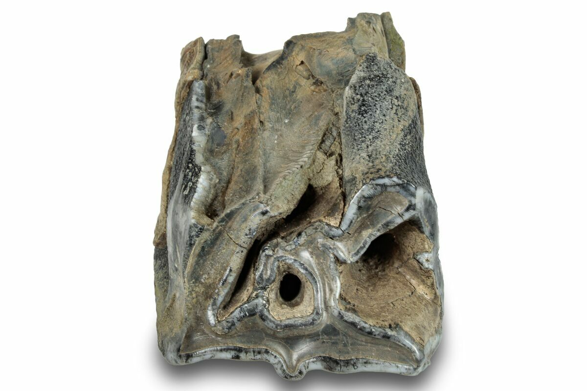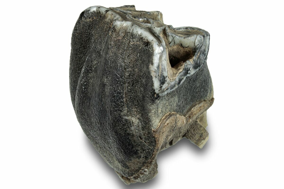 This is a well preserved fossil tooth crown from the upper jaw of a woolly rhinoceros (Coelodonta antiquitatis). The enamel is very well preserved, with black-grey tones coating most of the crown. This fossil comes from Siberia, Russia, where many Woolly Mammoth and Rhino fossils are unearthed. The tooth measures 2.65" tall and has some damage along one side.