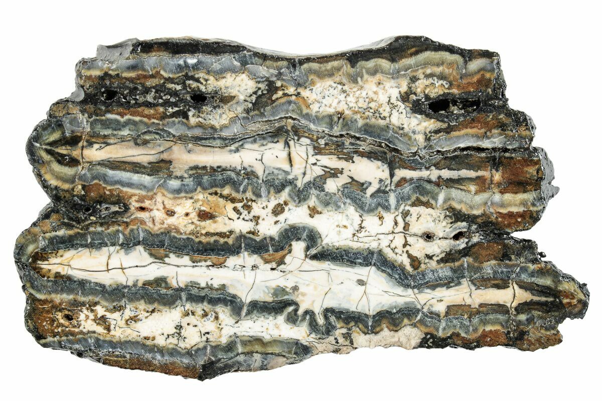 This is an interesting cross-sectional slice of a Columbian mammoth (Mammuthus columbi) molar collected from a river in South Carolina. While complete mammoth molars in these rivers are rare, finding partial or fragmented molars is not uncommon. These partial mammoth molars are collected by divers who primarily look for Megalodon teeth on the river bottom. Many of these fragments are sliced just like this specimen, revealing unique new patterns within the enamel.