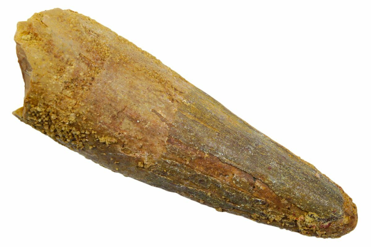 Spinosaurus teeth are relatively common fossils, but large (3+ inches), well-preserved examples are rare. These large Spinosaurus teeth will often be heavily doctored. We’ve seen many examples where multiple partial teeth can been glued to together to create a larger fake tooth, or where enamel has been painted on. One giveaway to look for is a ring of sand around the middle of the tooth, usually glued on to hide a break. Sometimes this is a sign that multiple partial teeth have been composited, but other times it is used to disguise a badly done repair job.