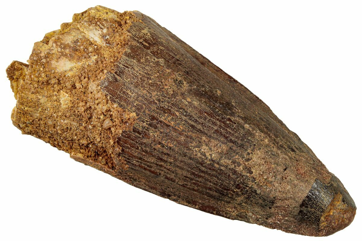 This is a 2.68" long Spinosaurus tooth from the Kem Kem Beds of Morocco. It is Late Cretaceous in age, approximately 95 million years old.