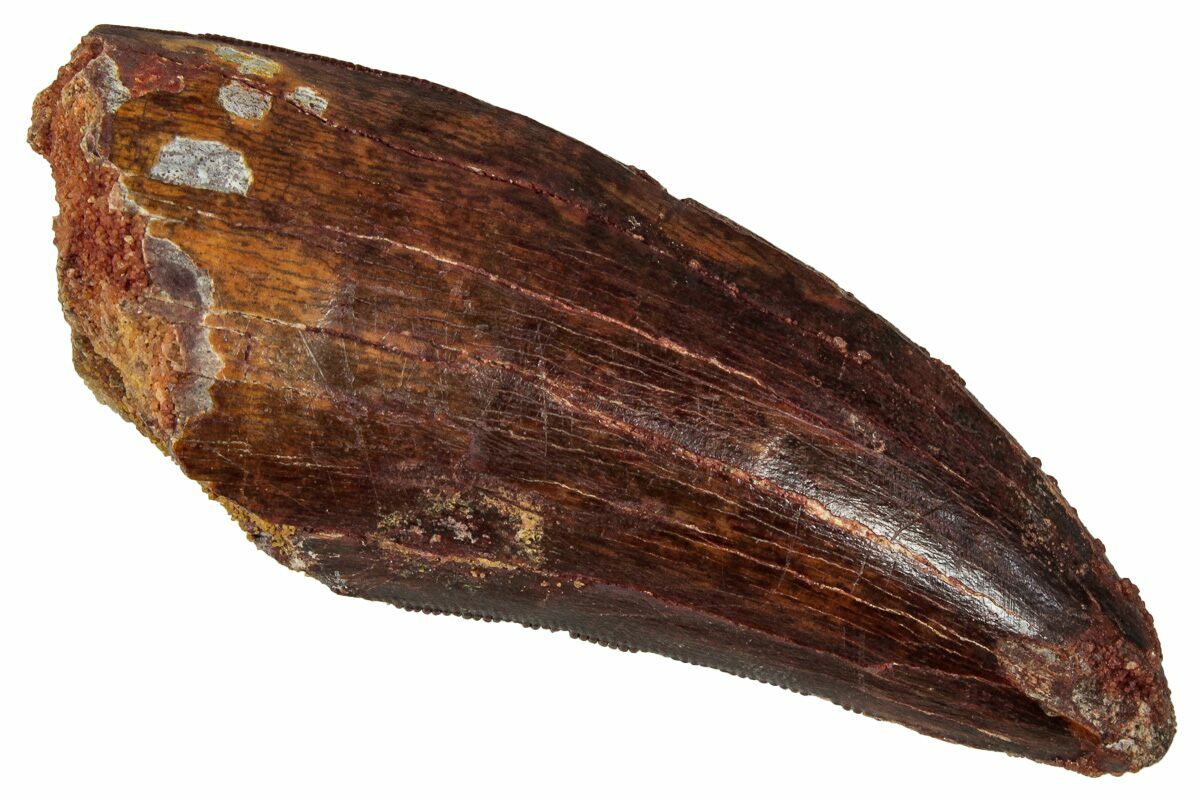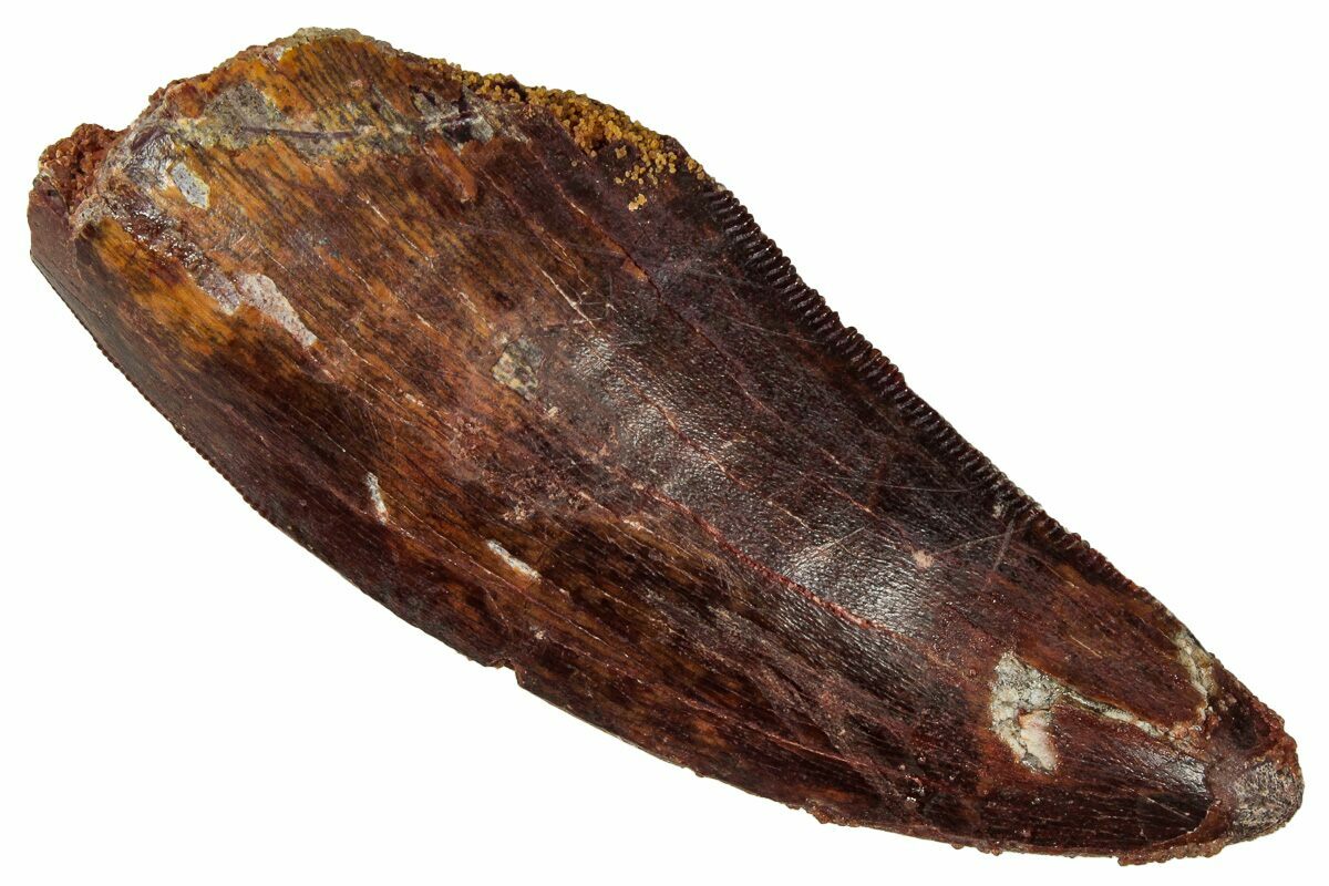 This is a good-sized, serrated, 2.69" long tooth of a Carcharodontosaurus from the Late Cretaceous Kem Kem Beds of Morocco. Carcharodontosaurus was a massive predatory dinosaur larger than Tyrannosaurus rex.