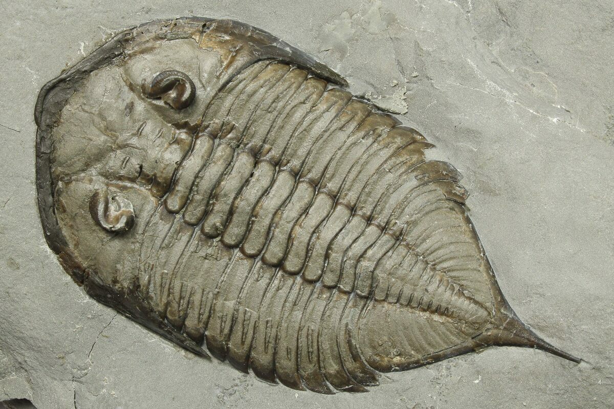 Dalmanites is a very visually striking trilobite is one of the classic North American fossils. The distinctive compound eye, believed to be a stereoscopic motion detector, had lenses made of rigid crystal. Its armor, spikes, and visual acuity imply that Dalmanites was trying to keep itself off the menu.
