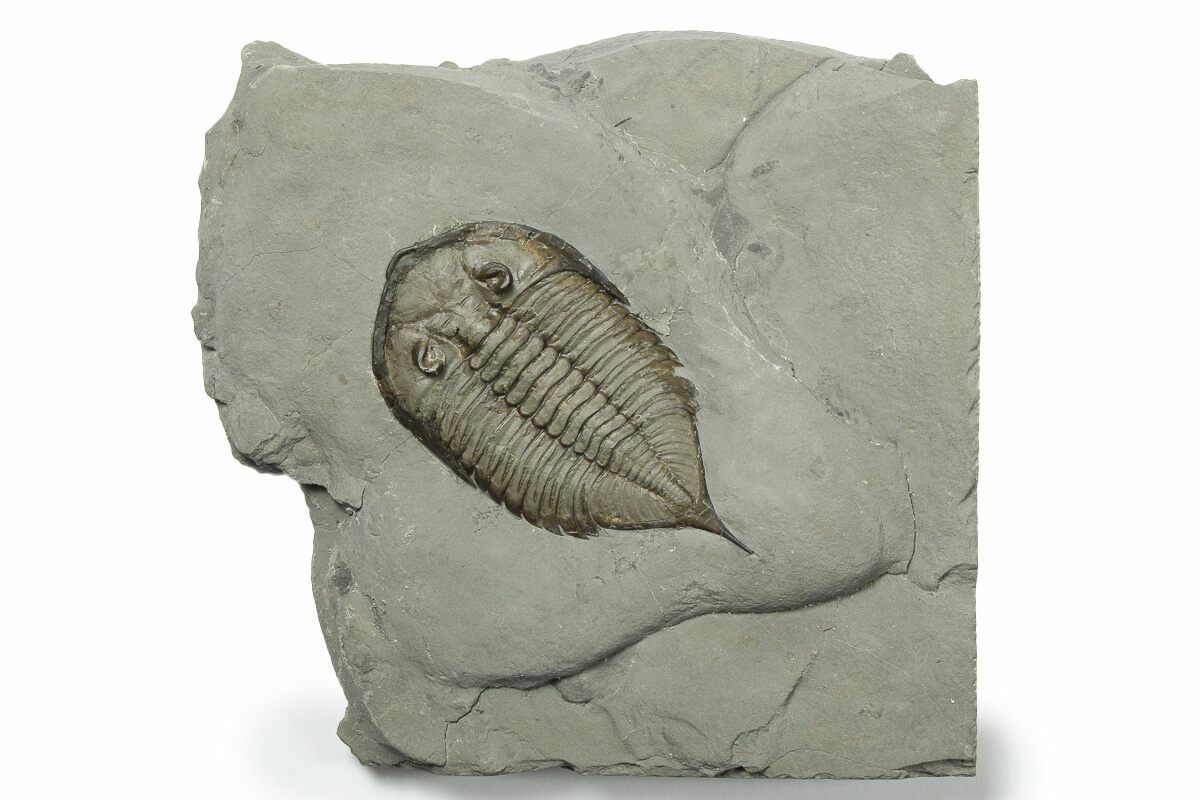This is a 2.7" long specimen of the classic New York, Silurian trilobite Dalmanites limulurus. It was collected from the famous Caleb's Quarry near Middleport, NY. This specimen is good sized for the species. There is some restoration around the front-left border of its head.