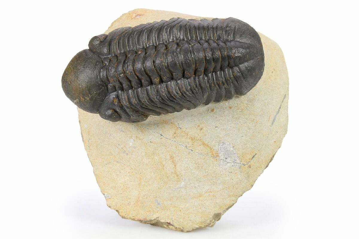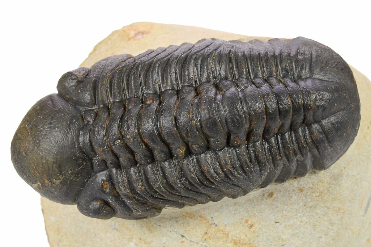 This is a 2.7" long, detailed Reedops trilobite collected near Atchana, Morocco. It has a lot of surface detail including visible preserved eye facets in its eyes. It has been prepared to remove the surrounding limestone so that it looks like it's ready to crawl off the rock. It has no restoration.