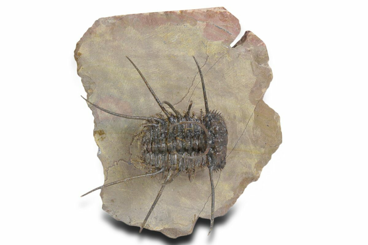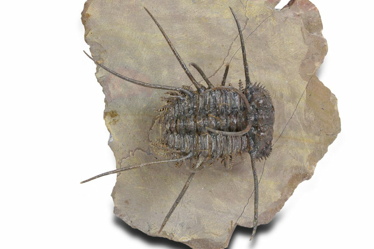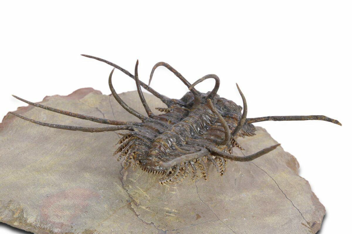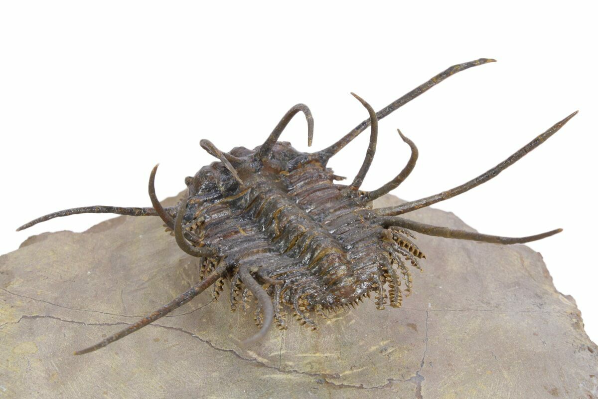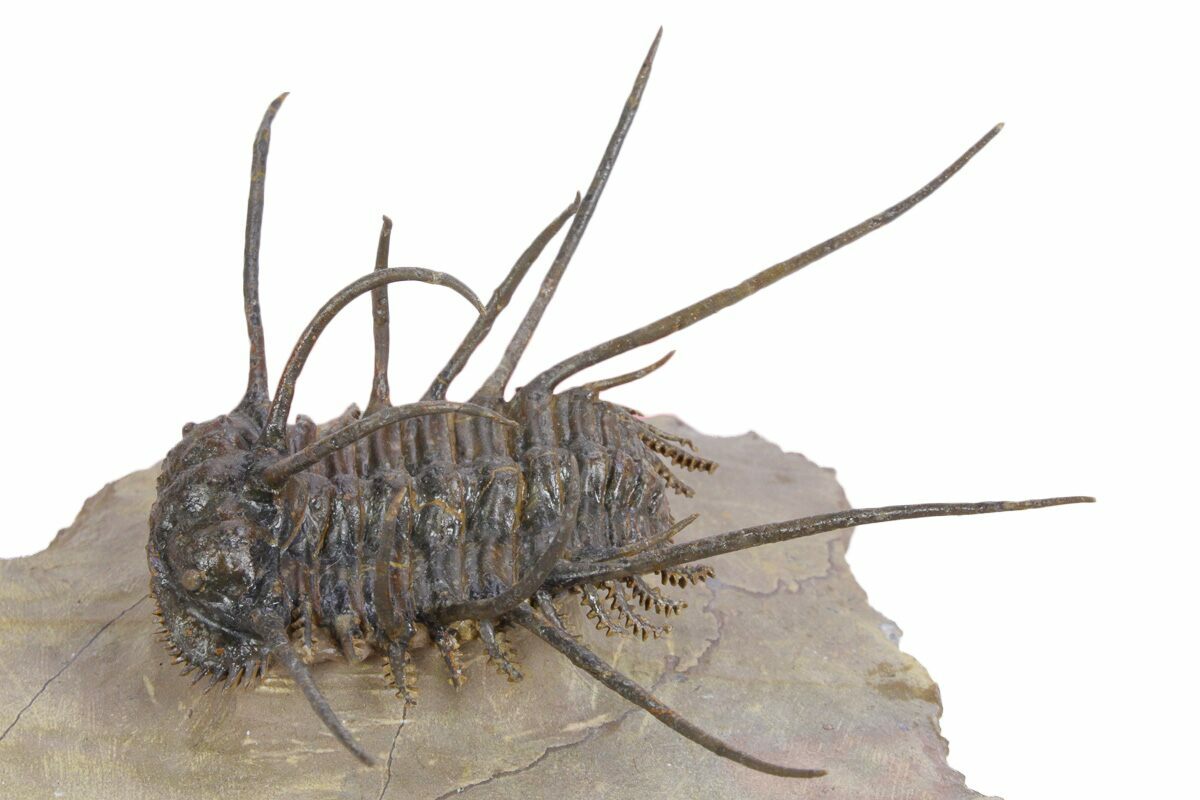 This is an incredible example of a rare, spiny Ceratonurus trilobite from the Lower Devonian of Morocco. This example has excellent shell quality, and all the long spines have been prepared free-standing. It has about 2-3% restoration in total, spread out on a number of small spots, mainly on repaired cracks in the spines.