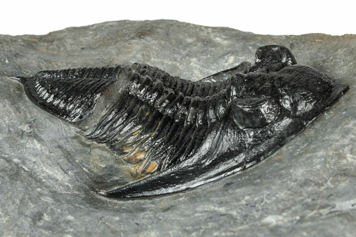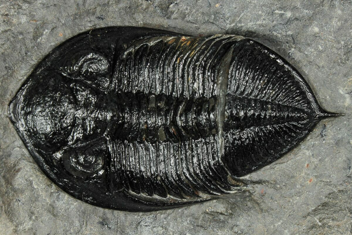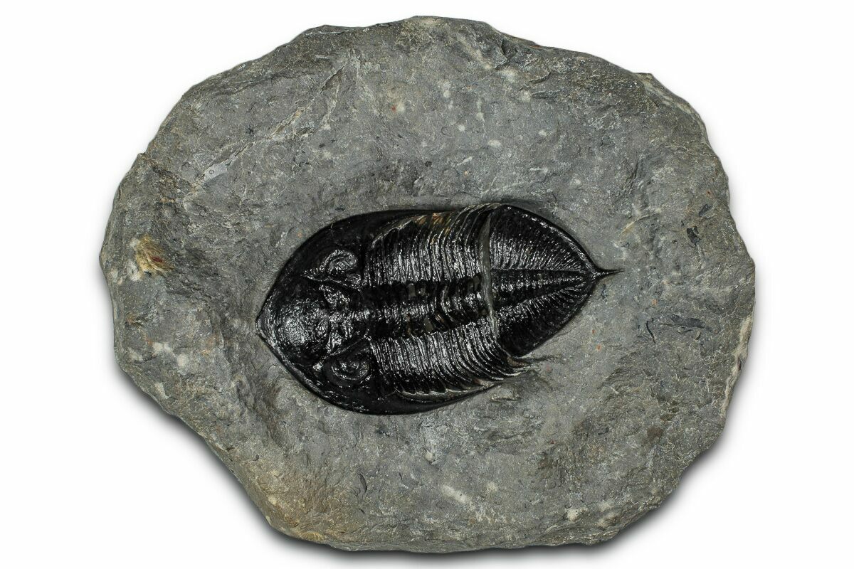 This is a detailed, 2.7" long prone trilobite (Zlichovaspis rugosa) collected from the Lower Devoniana (Pragian Stage) Lhandar Formation in Atchana, Morocco. It excellent eye facet preservation in both eyes. It has no restoration.