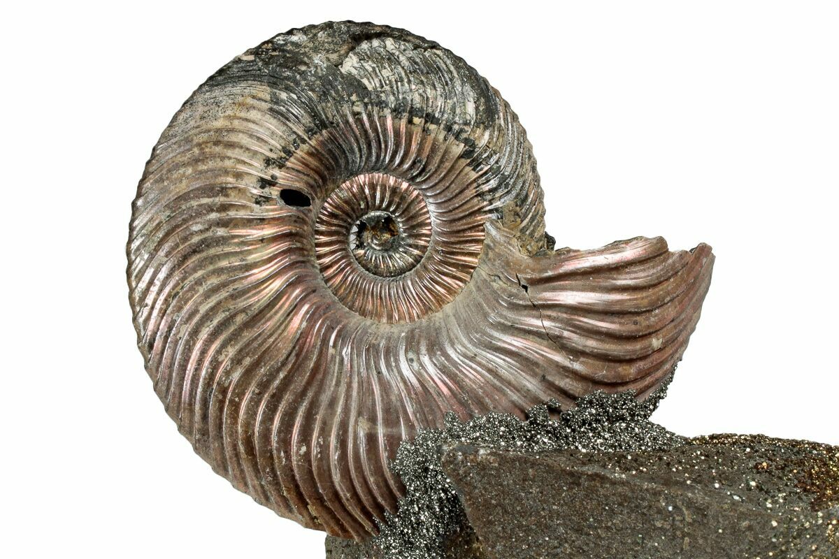 This is an interesting and colorful pyritized ammonite (Quenstedticeras sp.) display. The ammonite was collected from the Middle Jurassic age deposits along the banks of the Volga River near Saratov, Russia. It has been mounted to this section of iridescent pyrite ("rainbow pyrite") encrusted rock to create this alluring display.