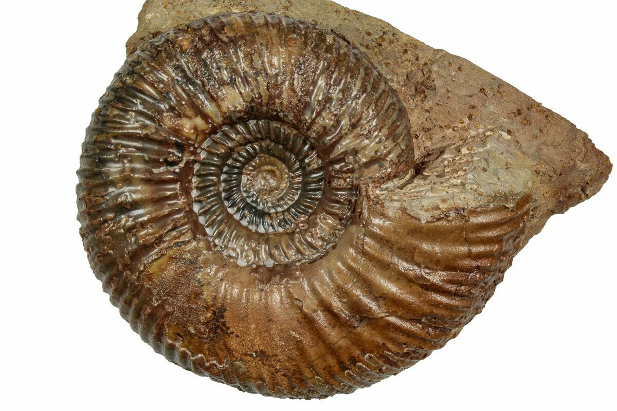 This is a beautiful, 2.7" wide ammonite (Parkinsonia sp.?) fossil from Sengenthal, Germany. This Jurassic-aged ammonite has been carefully exposed from the rock it was found in. The base of the rock has been cut flat for presenation.