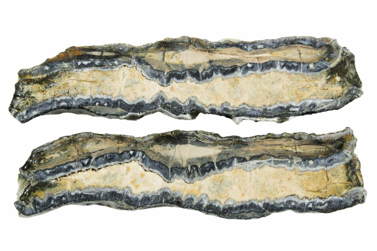These are two cross-sectional slices of a Columbia Mammoth (Mammuthus columbi) molar collected from the coastal region of South Carolina. They come in a Riker mount display case.