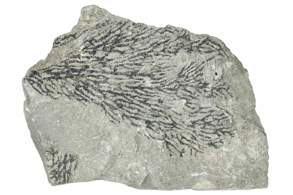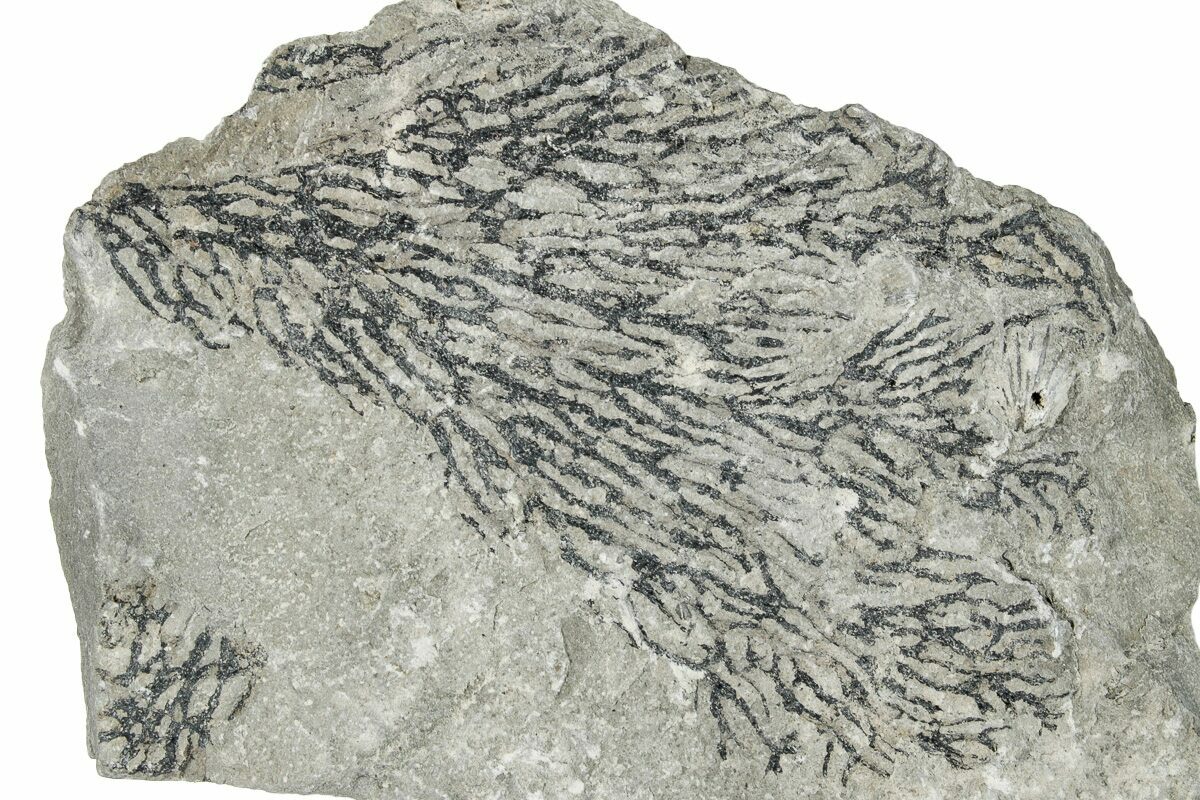 Graptolites are an extinct group of colonial, marine animals that thrived from the Cambrian through the Carboniferous period, reaching their peak diversity in the Ordovician. These ancient organisms are most commonly found as carbonized impressions on shale or slate, often appearing as fine, saw-blade or scribble-like markings on the rock surface.
