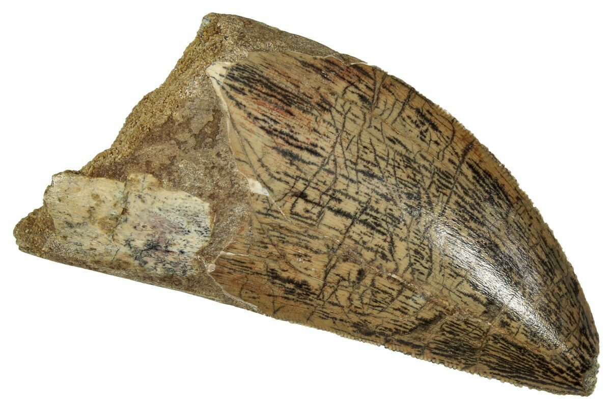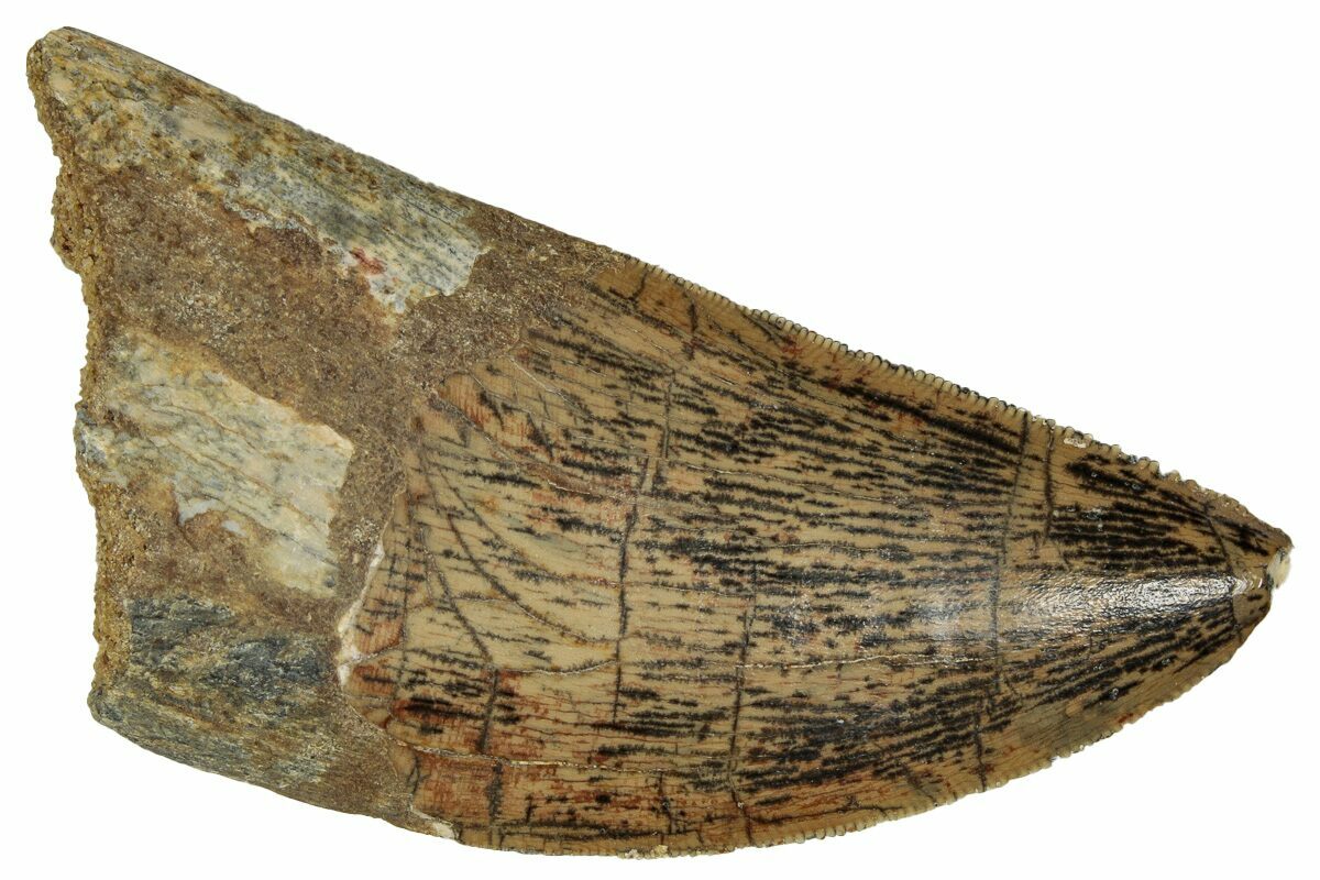 This is a good-sized, serrated, 2.70" long tooth of a Carcharodontosaurus from the Late Cretaceous Kem Kem Beds of Morocco. Carcharodontosaurus was a massive predatory dinosaur larger than Tyrannosaurus rex.