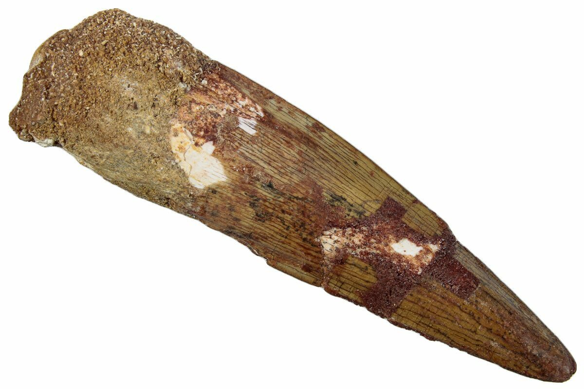 Spinosaurus teeth are relatively common fossils, but large (3+ inches), well-preserved examples are rare. These large Spinosaurus teeth will often be heavily doctored. We’ve seen many examples where multiple partial teeth can been glued to together to create a larger fake tooth, or where enamel has been painted on. One giveaway to look for is a ring of sand around the middle of the tooth, usually glued on to hide a break. Sometimes this is a sign that multiple partial teeth have been composited, but other times it is used to disguise a badly done repair job.