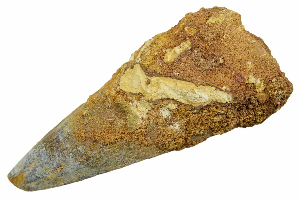 This is a 2.73" long Spinosaurus tooth from the Kem Kem Beds of Morocco. It is Late Cretaceous in age, approximately 95 million years old.