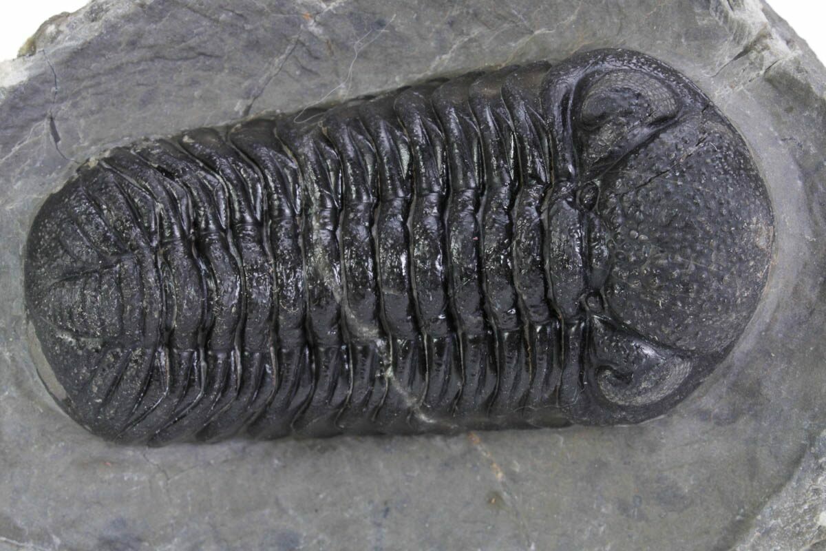 This is a big, fat, 2.75" long, prone Morocops trilobite from Ofaten, Morocco. There is excellent eye facet preservation in both eyes. It has no restoration.