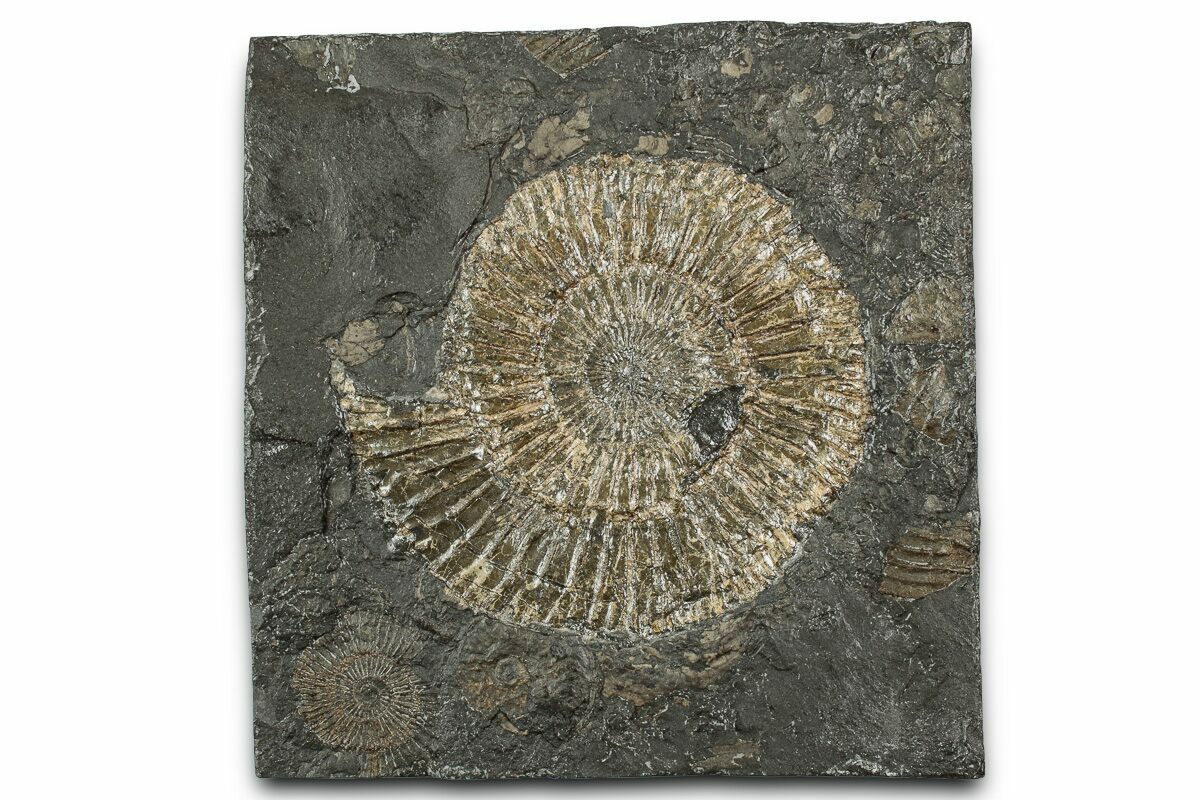 This is a 2.75" wide Dactylioceras ammonite fossil from the Posidonia Shale of Germany. Additional, partial ammonites can be seen around the rock as well. Ammonites from this location have been compressed and are preserved on a black slate in a partially pyritized state.