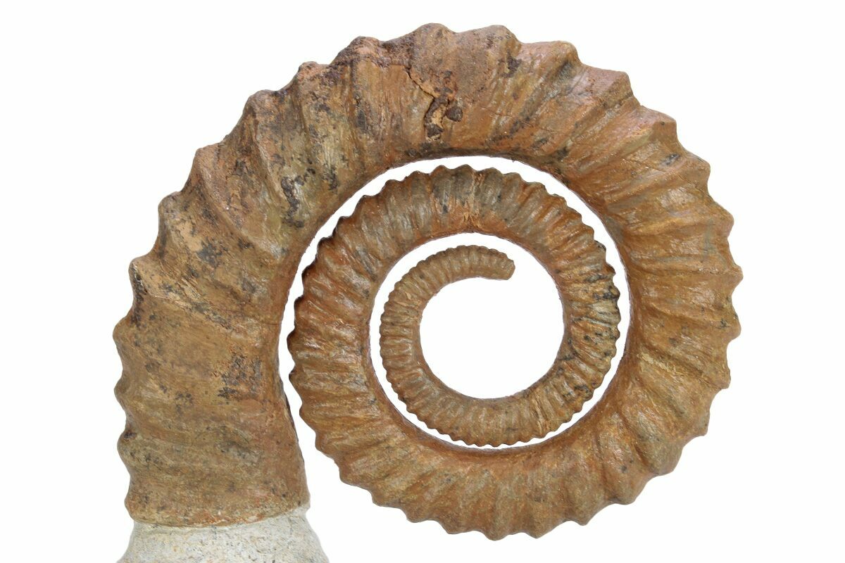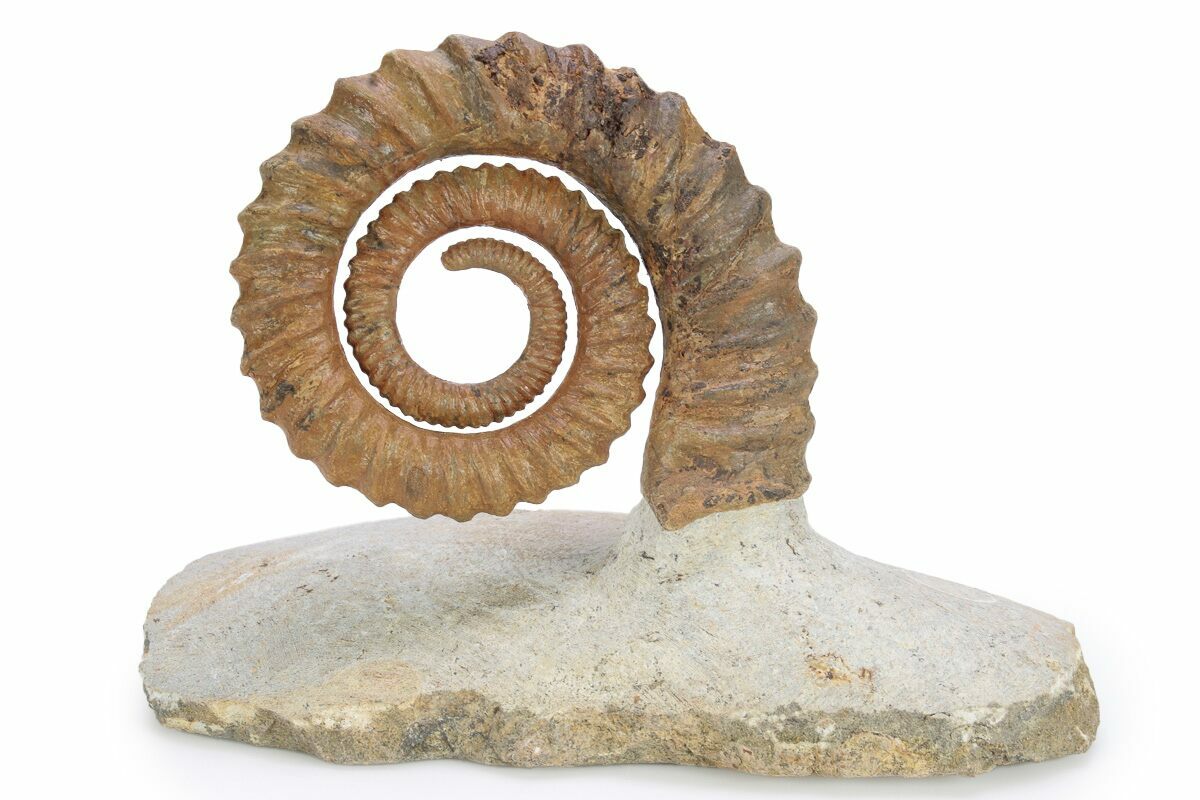 This is an impressive, 2.75" Early Devonian ammonoid cephalopod (Anetoceras) collected near Tazarine, Morocco. Nearly all of the limestone surrounding it has been removed during preparation, creating a very aesthetic display. The orange coloration is natural and it has no restoration.