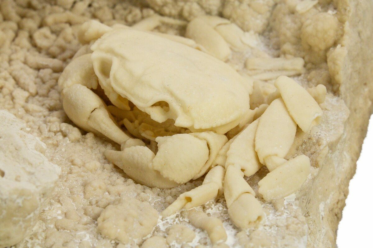 This is a spectacular fossil freshwater crab (Potamon potamios) preserved in travertine from the Denizli Basin in Southwest Turkey. The crab itself is 2.75" wide (including legs) and exhibits very detailed three-dimensional preservation. It's preserved as an outer cast within a natural cavity in white travertine.