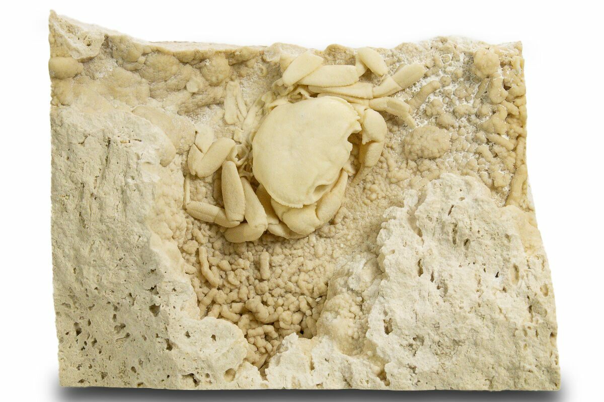Travertine is a type of limestone that forms around mineral springs. It is often quarried for use as a building material, and that is how these crabs were discovered. They are found when hollow voids are cut into while sawing blocks of travertine. The travertine deposits in the Denizli Basin are Pleistocene in age, having been formed within the past 400,000 years.