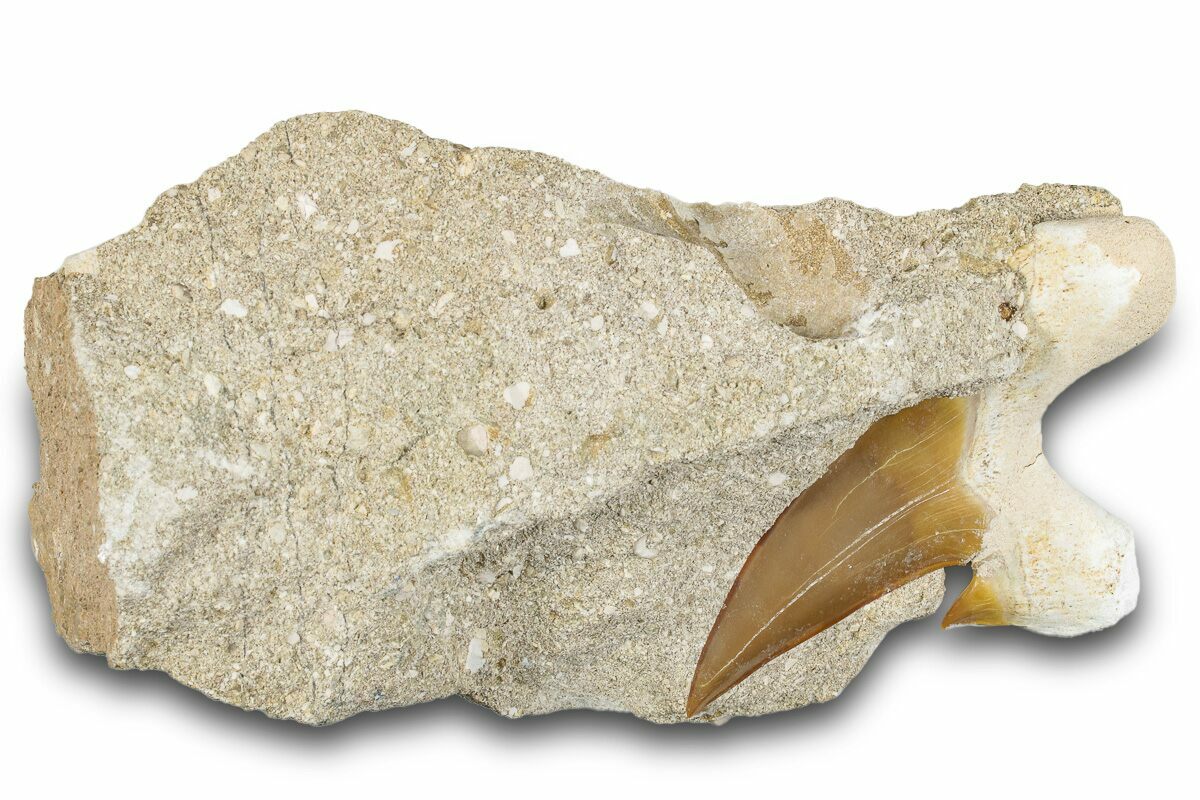 This is a 2.75" fossil tooth of the extinct giant mackerel shark, Otodus obliquus, from the phosphate deposits in the Oulad Abdoun Basin of Morocco. It is Eocene in age, or approximately 54 million years old. The tooth is only partially exposed from the rock in which it was found.