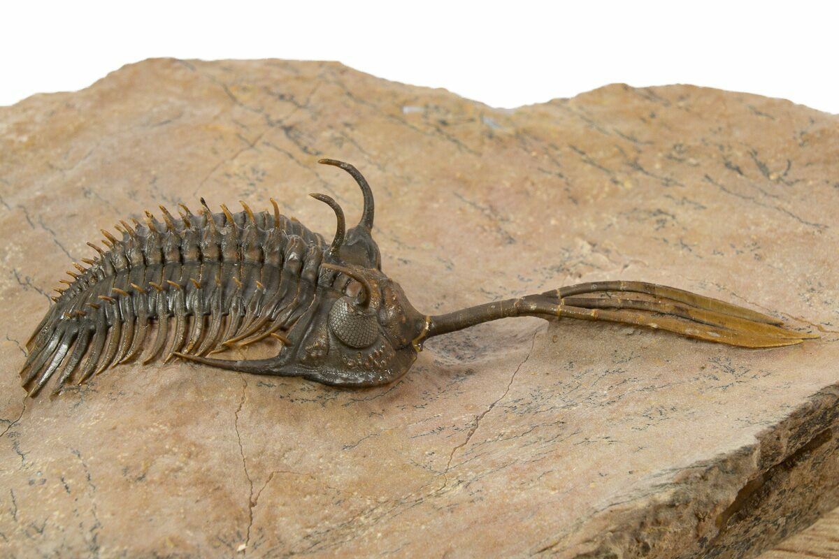 This is an exceptionally prepared specimen of Walliserops trifurcatus from Foum Zguid, Morocco. The work was done by one of the very best preparators in the world leaving the shell free of damage from air abrasion. Check out the pristine eye facets in both eyes and free-standing spines. Approximately 1% restoration along a repaired crack through the cephalon and the cephalic spines.