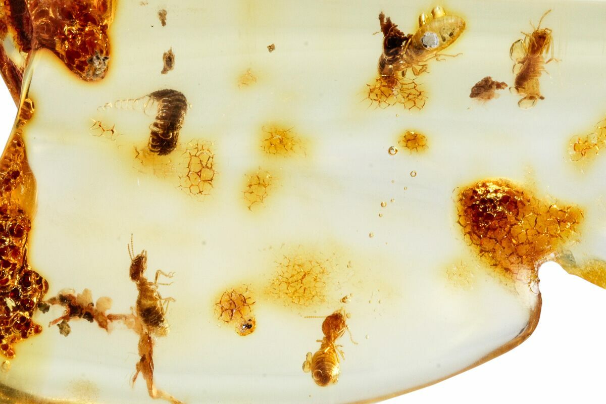 This is a polished piece of copal from Colombia. It contains a detailed millipede (class Diplopoda) and multiple termite (infraorder Isoptera) fossils. The copal bears gorgeous golden honey coloration, measures 2.76" wide, and weighs 9 grams. The entire specimen has been polished to a glossy-finish.