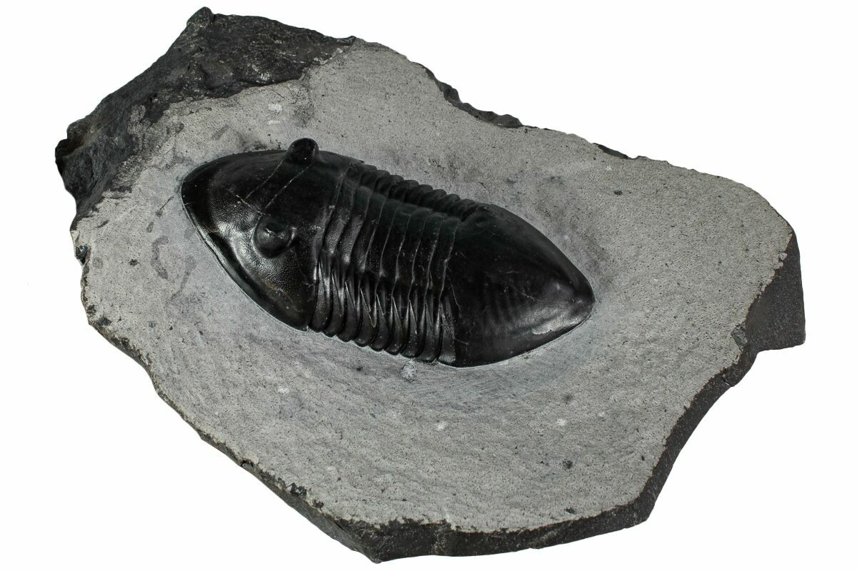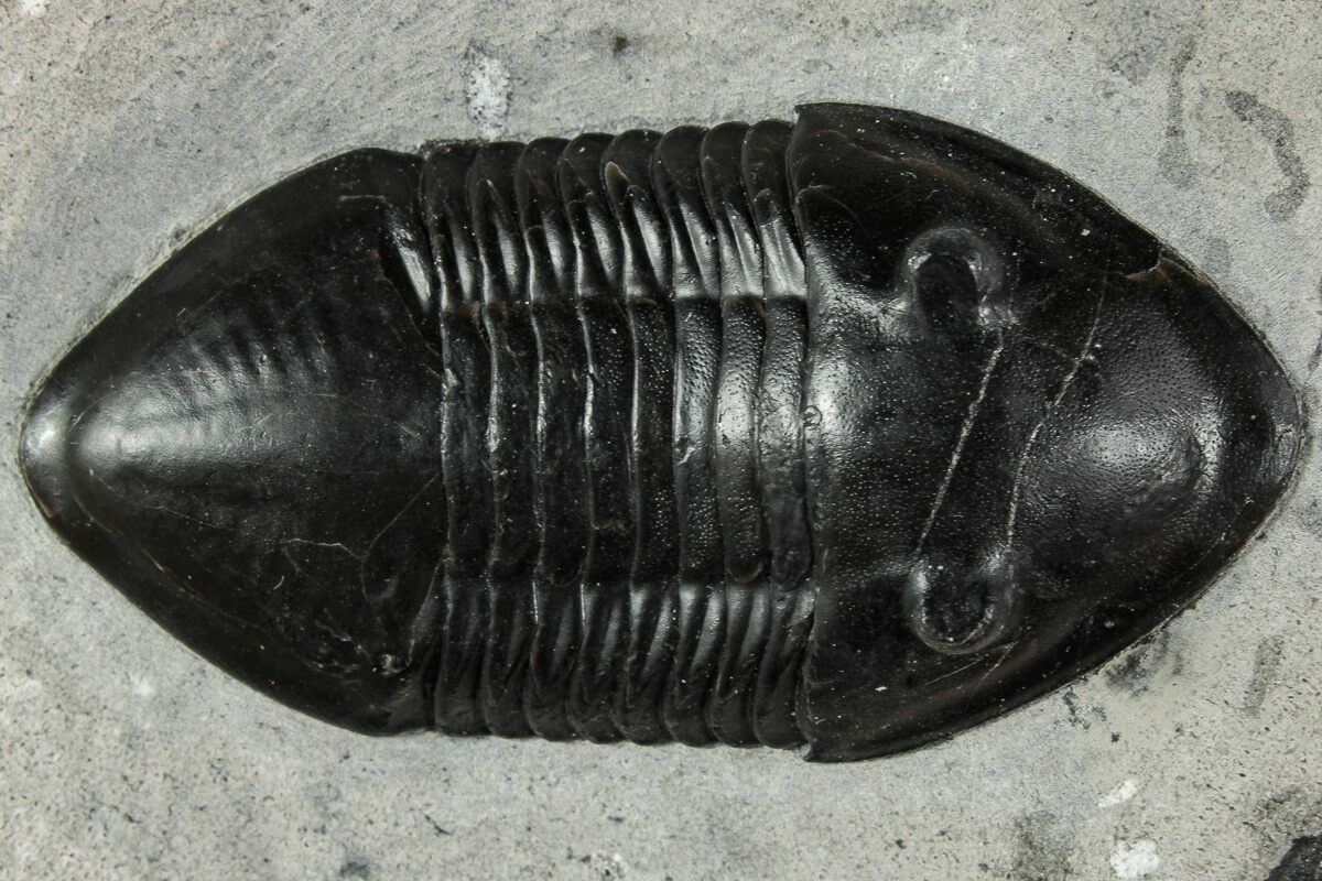The trilobite is gorgeous with a jet black shell preservation and is nicely centered on a piece of limestone. There is some restoration to the left eye and across some of the segments and cephalon where the shell was fragmented during collection.