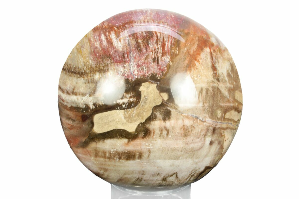 This is a colorful, 2.8" wide, polished sphere of petrified wood from Ambilobe, Madagascar. It is from the Araucaria tree, a type of conifer. The petrified wood is from the early Triassic period, approximately 220 million years old, close to the time the first dinosaurs appeared on the planet.