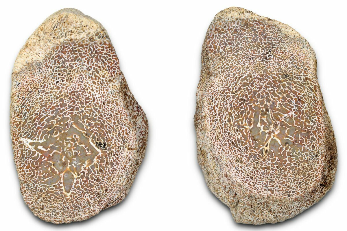 Dinosaur gembone (agatized dinosaur bone) forms when the porous structure of dinosaur bone is replaced by silica-rich minerals like agate, chalcedony, or jasper. This preserves the bone’s internal cell patterns, creating striking, web-like textures visible when polished.