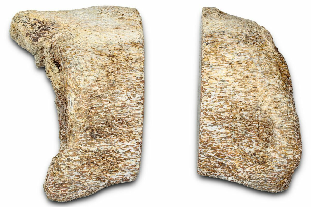 This is a dinosaur vertebra from the Morrison Formation of New Mexico preserved with very vibrantly colored agate replacement (gembone). It has been sliced in half and polished to reveal the amazingly colored, internal cell structure. Both halves are included and each measure around 2.8 x 1.8 x 1.7"