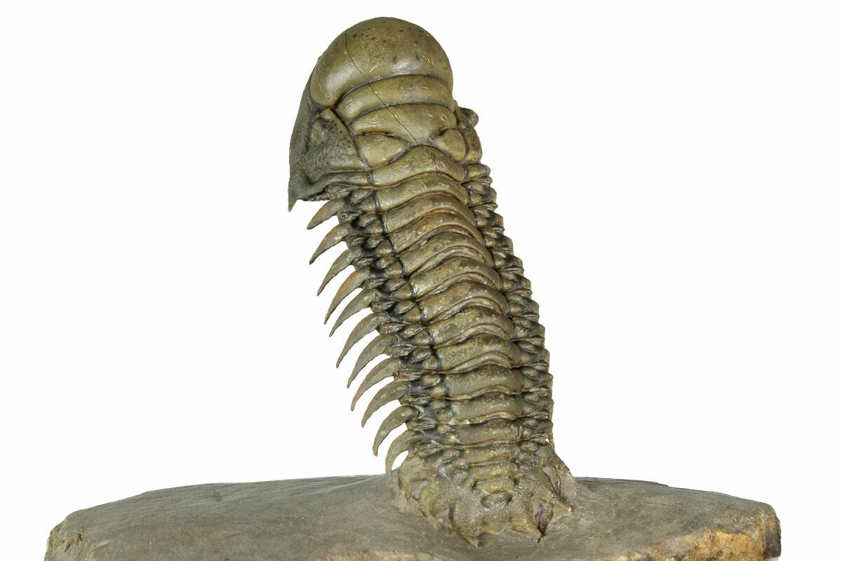 This is an exceptional 2.8" specimen of Crotalocephalina gibbus from Atchana, Morocco. Expertly prepared, it displays outstanding shell detail and a dramatic “flying” pose — the surrounding limestone has been meticulously removed so the trilobite appears suspended above its base on a slender pedestal. This type of preparation requires many hours of precision work but creates a stunning, lifelike presentation. The hypostome (mouthplate) is fully exposed beneath the head and it has less than 1% shell restoration.