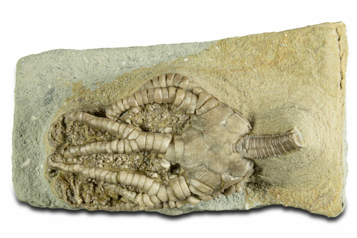Crinoids from the Ramp Creek Limestone were likely buried in sediment from nearby deltas during storms. The resulting siltstone deposits are soft enough that fossils can be extracted in exquisite, three-dimensional relief.
