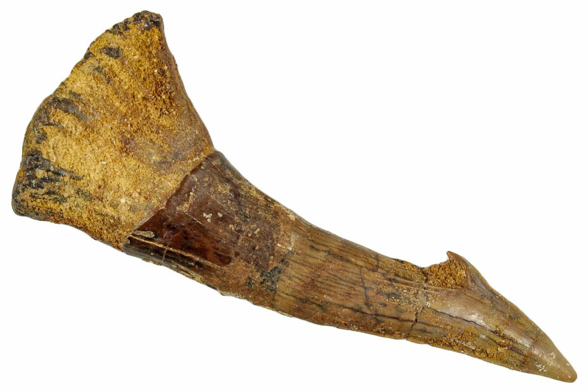This is a 2.8" long rostral barb/tooth from an extinct, giant sawfish (Onchopristis numidus). It was collected from the Kem Kem Beds in Taouz, Morocco.