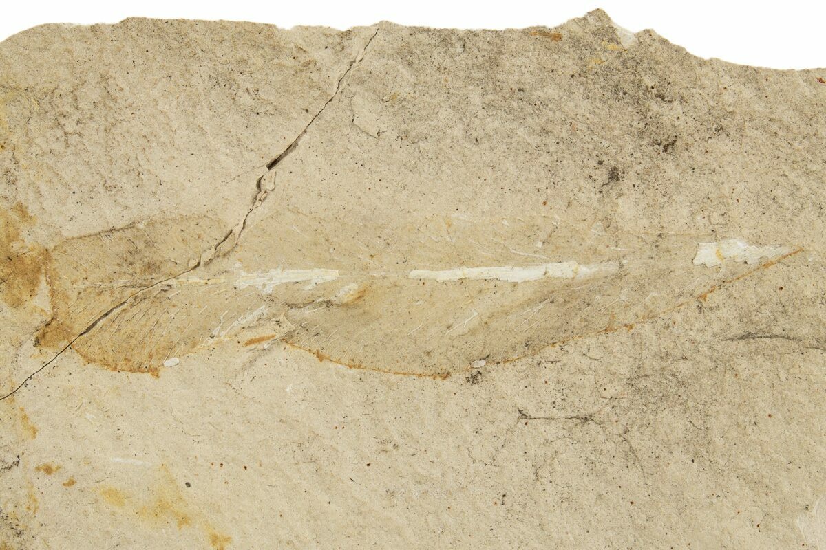 This is a 2.8" long fossil seed fern leaf of the species Glossopteris browniana. This specimen was collected from the Upper Permian aged Illawarra Coal Measures of New South Wales, Australia.