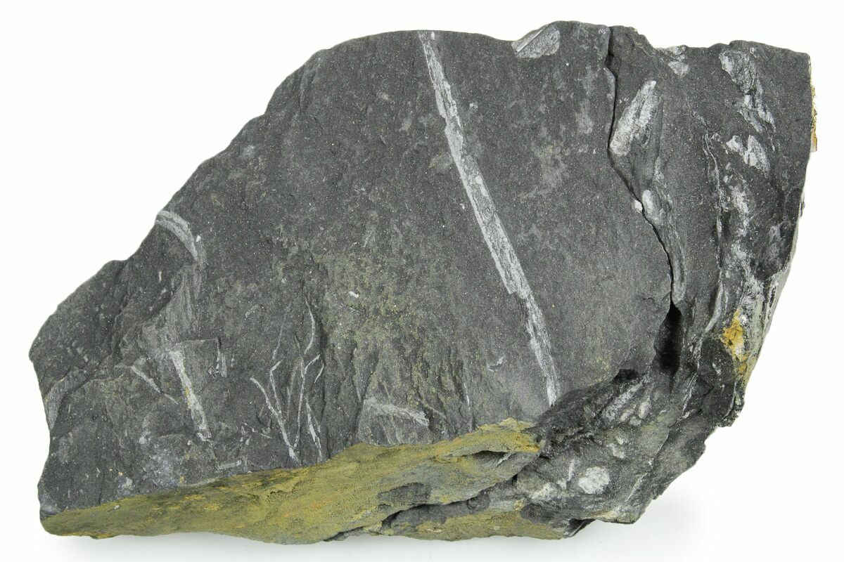 These plants were buried in a swamp where a low temperature, low pressure, and low oxygen environment caused the plant tissue to be slowly replaced by pyrite. This pyrite was later replaced by a whitish mineral (aluminum silicate) as the fossils were buried and exposed to the heat and pressure inside of the earth. The majority of the ferns on this plate are of the genus Alethopteris, though Pecopteris ferns can be seen from time to time.