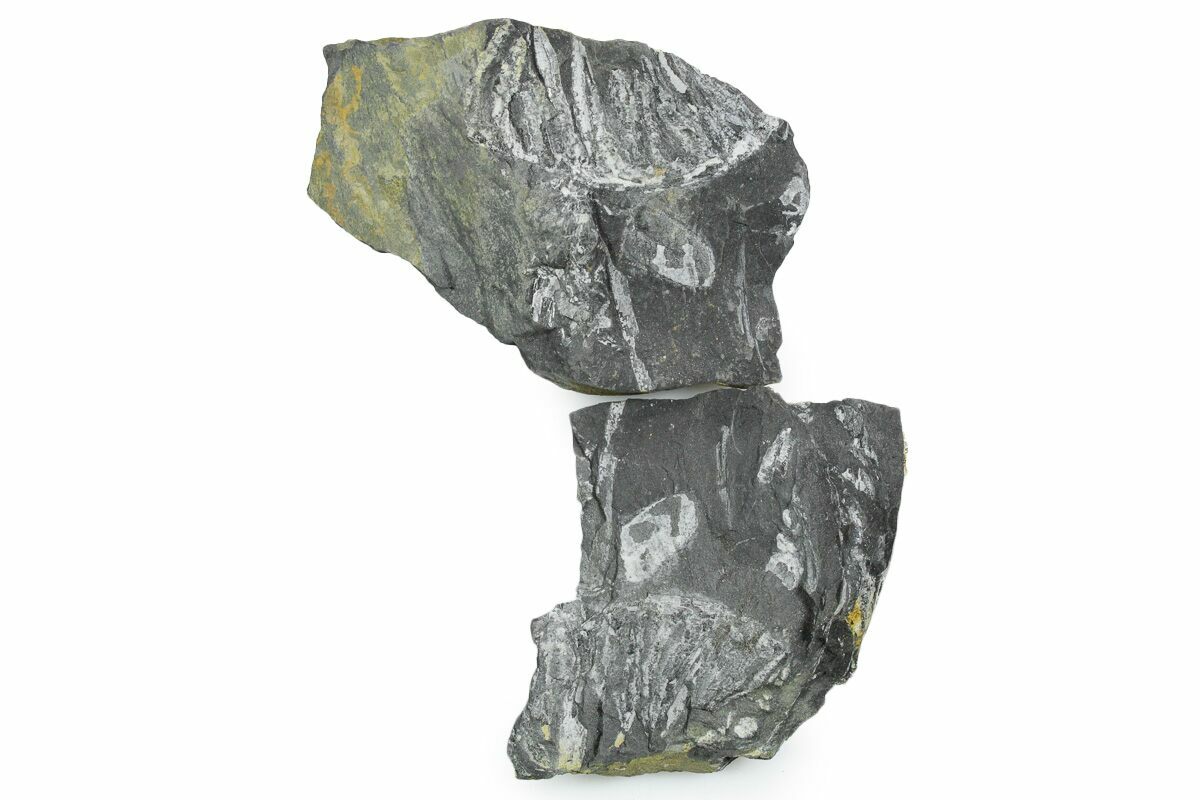 This is a pair of 2.8" wide fossil seed ferns plates from the Pennsylvanian aged (305 million year) Llewellyn formation of Pennsylvania. Because of the way this material splits, both sides of the split rarely turn out like this. The white color of these detailed fern fossils contrasts well against the black shale they are preserved in. There are fossils covering both sides of the piece. These St. Clair fern plates used to be quite common but access to the locality is now restricted so there is not a lot of material left on the market.