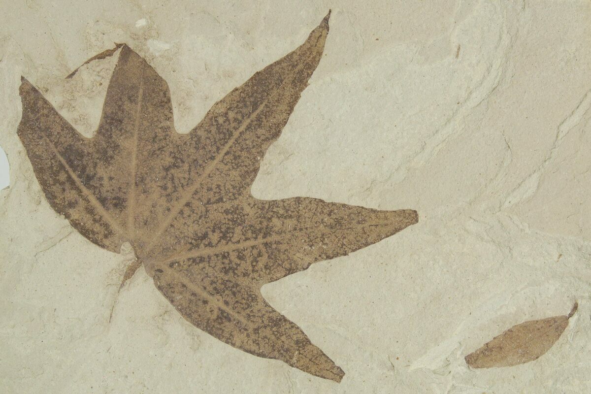 This is a 2.8" wide fossil sycamore (Macginitiea wyomingensis) leaf from the Green River Formation of Utah. It shows detailed primary venation and the dark color of the leaf contrasts nicely against the cream-colored shale. It's preserved alongside a small Cedrelospermum nervosum leaf, an extinct species of plant classified within the Ulmaceae family, which includes modern trees like elm and hackberry. While the Green River Formation is best know for its fish fossils, other areas produce incredible plant fossils.
