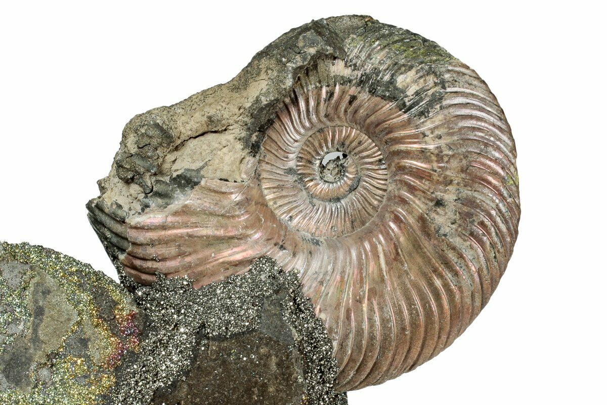 This is an interesting and colorful pyritized ammonite (Quenstedticeras sp.) display. The ammonite was collected from the Middle Jurassic age deposits along the banks of the Volga River near Saratov, Russia. It has been mounted to this section of iridescent pyrite ("rainbow pyrite") encrusted rock to create this alluring display.