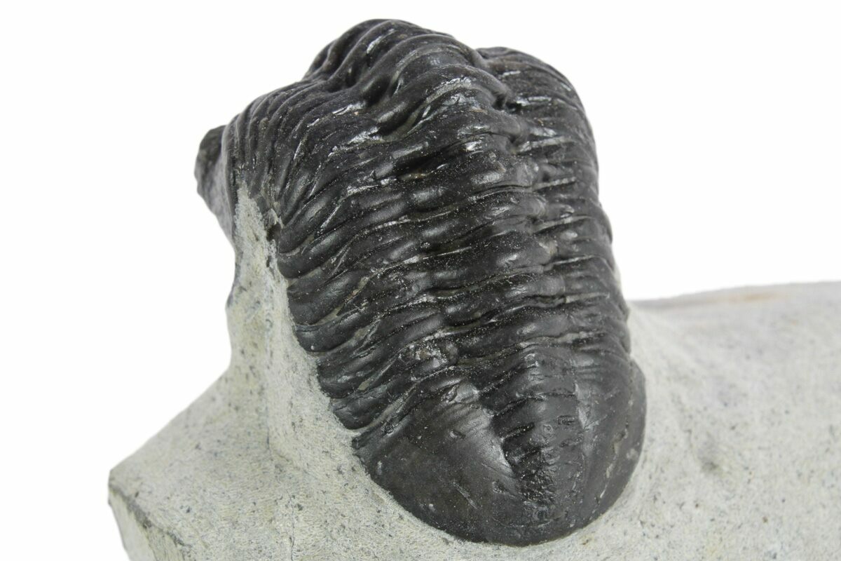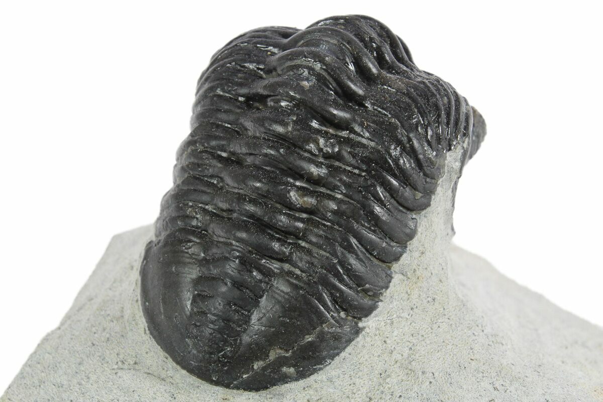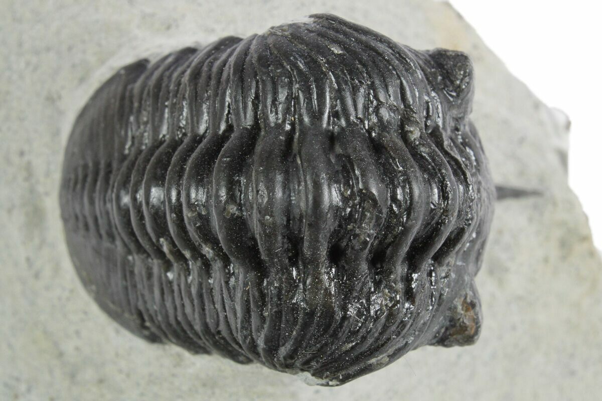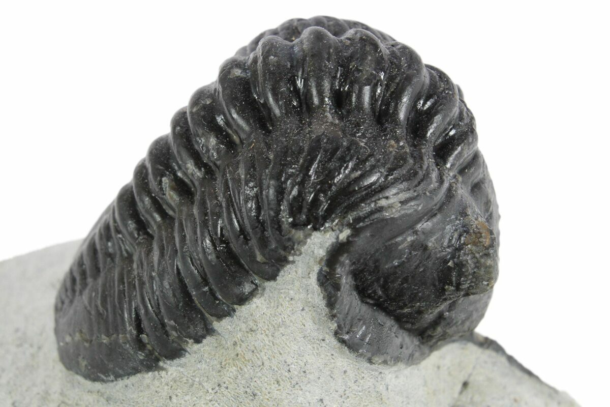 Here is a 2.5" long, phacopid trilobite (Morocconites malladoides) quarried from the deposits near Ofaten, Morocco. This member of the Phacopida trilobites has a very defining feature, a long pointed rostrum (snout) coming off of its head. It's unclear what purpose this rostrum would have served, but it could have potentially been used to help it dig through the mud.