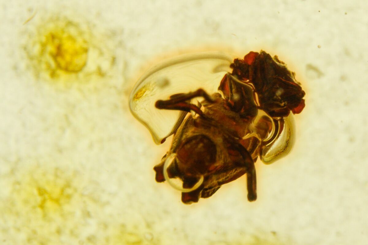 This is a polished piece of copal from Colombia. It contains beetle (order Coleoptera) and termite (infraorder Isoptera) fossils. The copal bears gorgeous golden honey coloration, measures 2.8" wide, and weighs 13.6 grams. One side of the specimen has been polished to a glossy-finish.