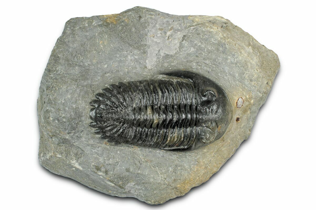 This is a pone, 2.8" long, Hollardops trilobite from the Ofaten region of Morocco. It features visible eye facet preservation in both compound eyes. It only has about 5% shell restoration almost entirely on i's tail.