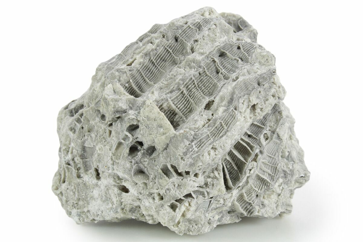 This is an interesting 2.8" wide section of dolostone containing fossil rugose coral of the species Fletcheria guelphensis. It has been left in its rough state to reveal the sparkling interior of the coral's "skeleton". The dolostone was collected from a Middle Silurian-aged deposit within the Greenfield Formation in Clay Center, Ohio.