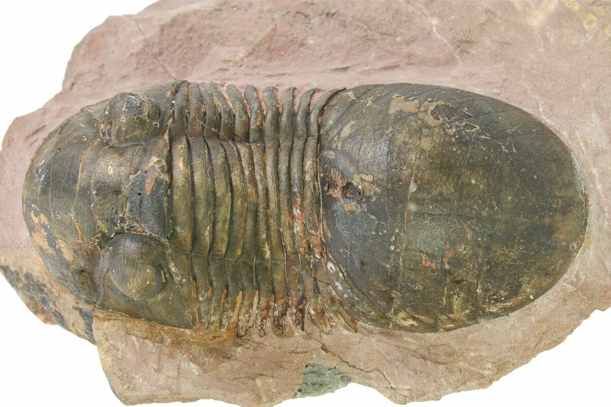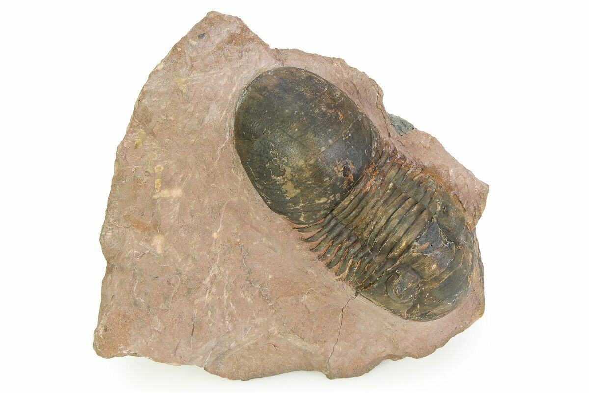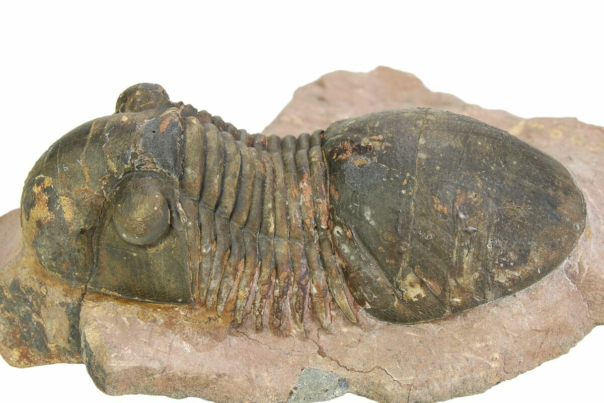 This is a 2.8" long Paralejurus trilobite quarried at Lghaft, Morocco. It has about 5% shell restoration in total.