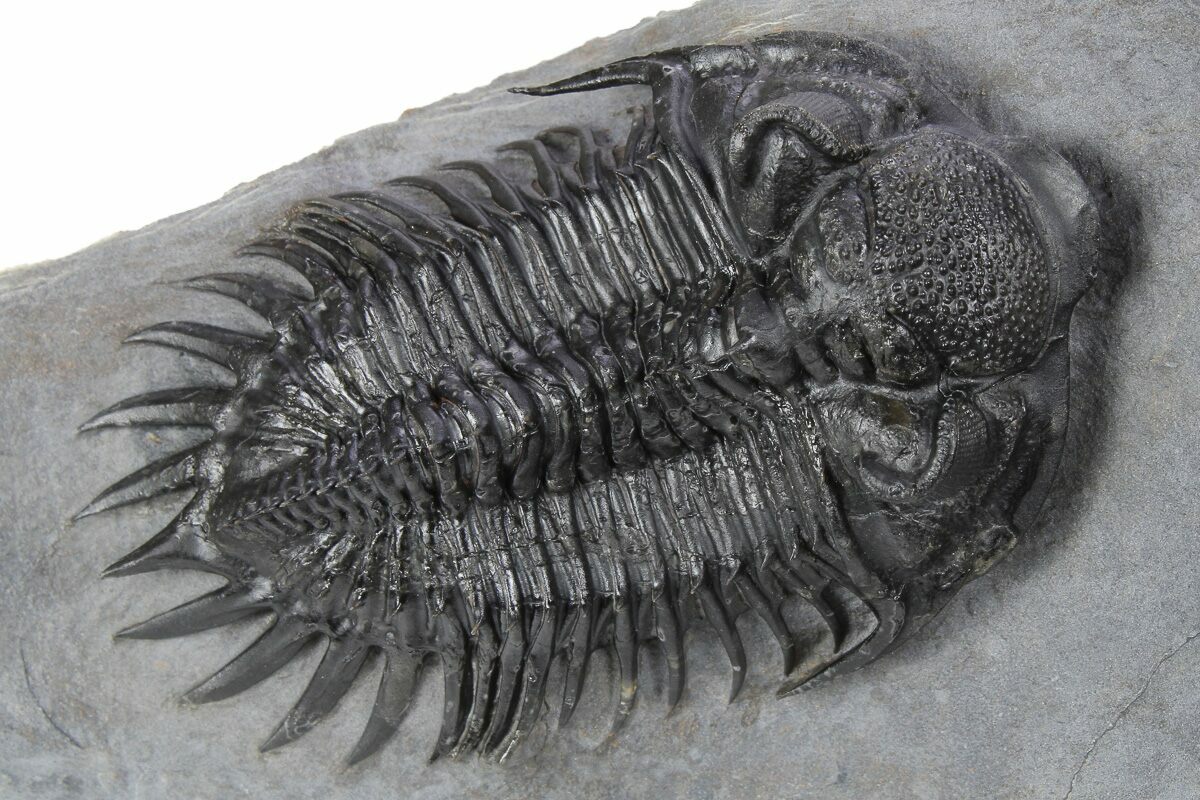 This is a beautiful specimen of Delocare bensaidi from Bou Lachrhal, Morocco. The preparation is fantastic with excellent eye facet detail and dozens of free-standing, tiny spines. There is about 5% shell restoration as the shell on trilobites from this site tends to peel really badly when split. Overall it's probably the best looking example of this scarce species that we have had.