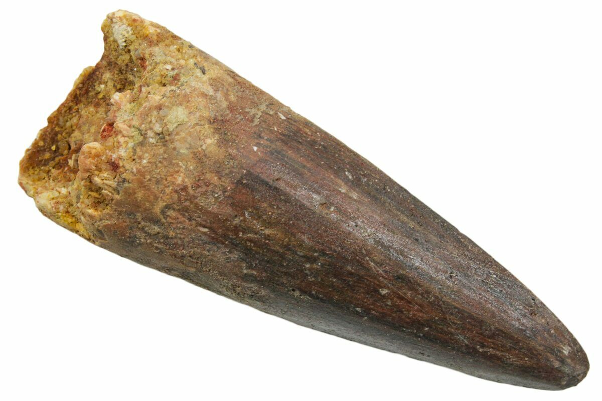 This is a 2.81" long Spinosaurus tooth from the Kem Kem Beds of Morocco. It is Late Cretaceous in age, approximately 95 million years old.