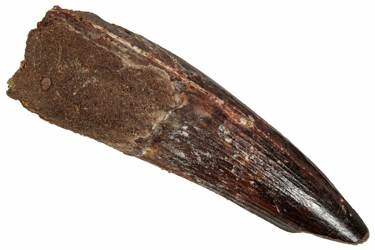 This is a 2.82" long Spinosaurus tooth from the Kem Kem Beds of Morocco. It is Late Cretaceous in age, approximately 95 million years old.