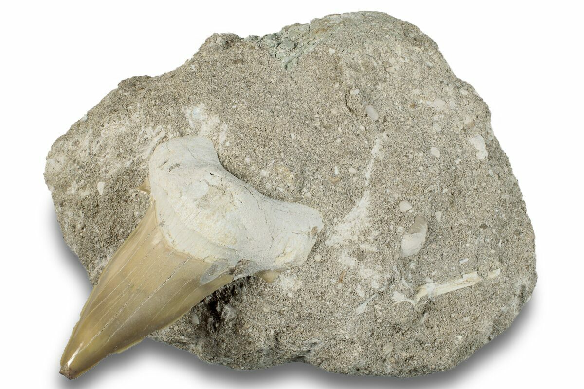 This is a 2.82" fossil tooth of the extinct giant mackerel shark, Otodus obliquus, from the phosphate deposits in the Oulad Abdoun Basin of Morocco. It is Eocene in age, or approximately 54 million years old. The tooth is only partially exposed from the rock in which it was found.