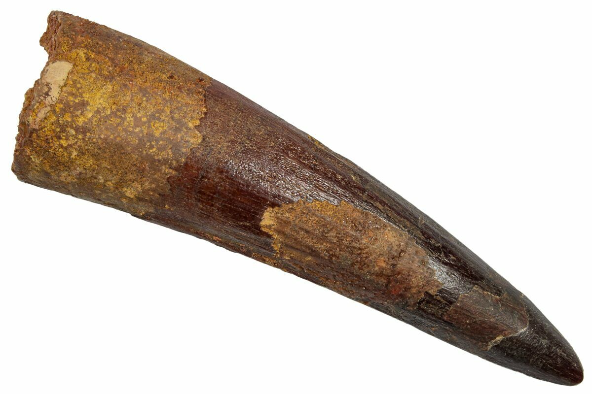 This is a 2.83" long Spinosaurus tooth from the Kem Kem Beds of Morocco. It is Late Cretaceous in age, approximately 95 million years old.